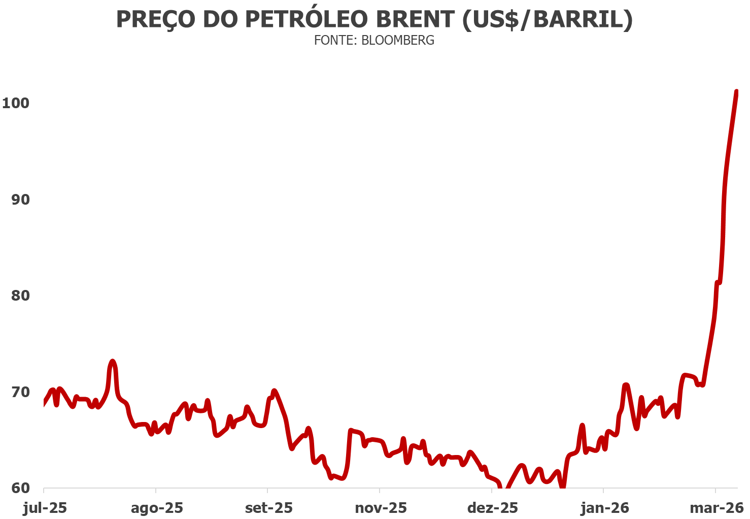 Por último mas não menos importante, maiores preços do petróleo também têm reflexos nas exportações brasileiras. Óleos brutos estão entre os nossos principais produtos exportados, superando importações de combustíveis, óleos minerais e petroquímicos. Isso significa impacto positivo imediato em nosso saldo comercial. Mas essa vantagem pode ser parcialmente neutralizada por menores exportações brasileiras destinadas ao Oriente Médio, com destaque para as vendas externas de carnes de aves, milho e açúcar. Em resumo, o conflito no Oriente Médio, com maiores preços de petróleo, favorece liquidamente o nosso saldo comercial. Por outro lado, aumenta a probabilidade de menor afrouxamento da política monetária e maiores gastos com juros sobre a dívida pública.