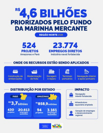 Com a regionalização dos dados do FMM, o Ministério de Portos e Aeroportos reforça a transparência da política pública, ao mesmo tempo em que evidencia o impacto dos investimentos na ampliação da infraestrutura aquaviária, na geração de empregos e no desenvolvimento sustentável da Região Norte.