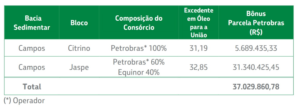 O valor do bônus de assinatura a ser pago em março de 2026 pela companhia é de cerca de R$ 37 milhões. O quadro abaixo resume o resultado da participação da Petrobras no 3º Ciclo da Oferta Permanente de Partilha de Produção da ANP: