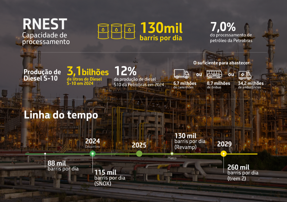 “Com a ampliação da capacidade de refino da RNEST estamos gerando empregos, fortalecendo o desenvolvimento regional e aumentando a oferta de combustíveis de melhor qualidade para a população brasileira. Ao final das obras, a refinaria atenderá a até 17% da demanda nacional por diesel, reforçando a segurança energética do país”, afirma a presidente da Petrobras, Magda Chambriard.